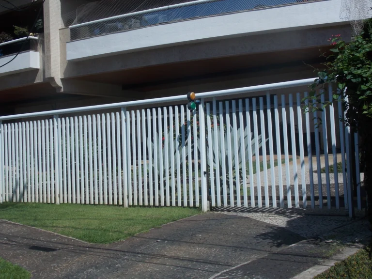 Neste portão branco foi dada uma solução bem inteligente. A estrutura interna foi feita na cor bronze e dá uma sensação que os tubos verticais brancos estão soltos, flutuando.